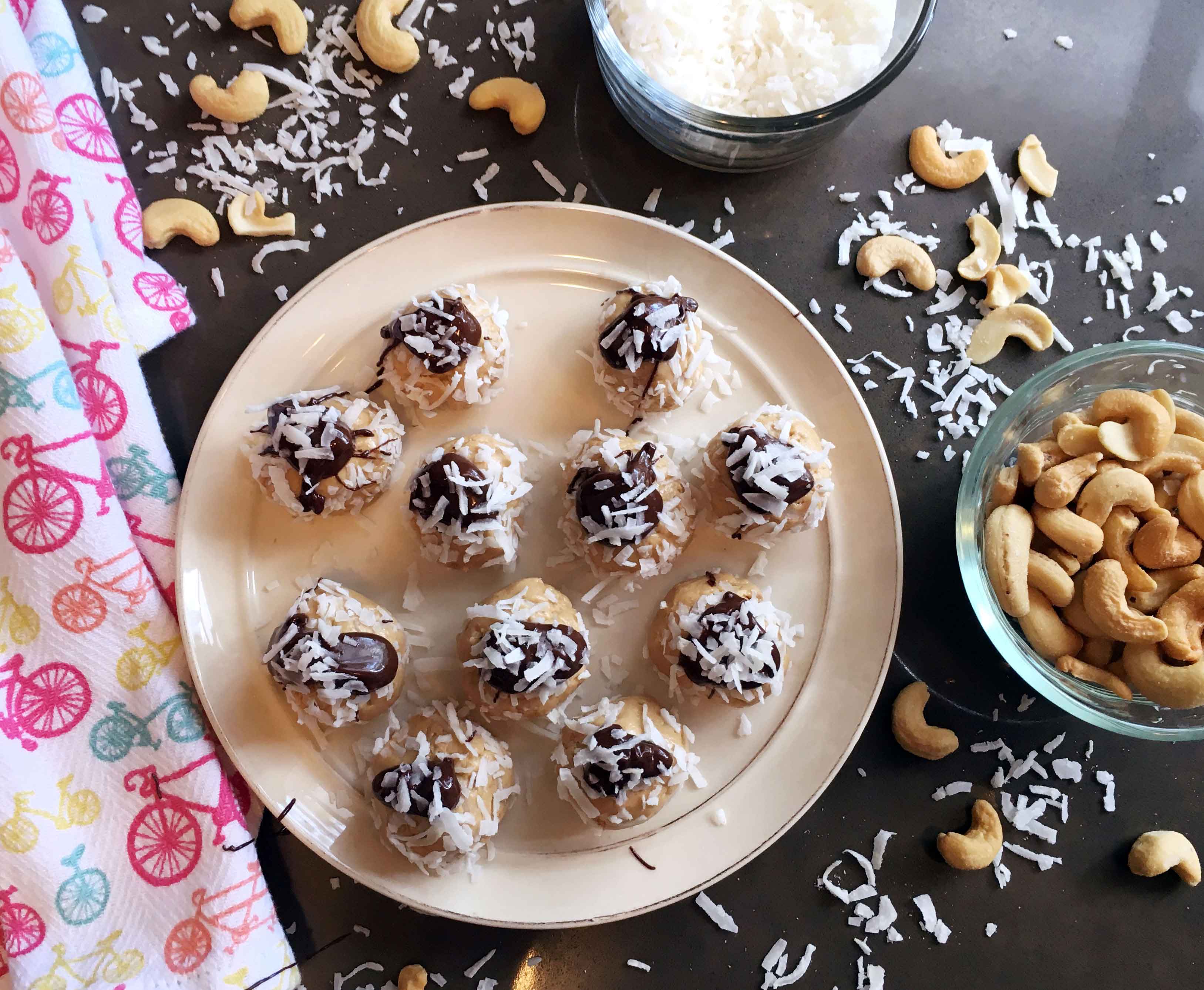 In a small bowl combine the cashew butter, honey and protein powder. Then, add in the 2 tbsps coconut flakes. Take spoonfuls and roll into about 2 inch balls. Put the extra tbsp of coconut flakes on a plate and roll the balls in the coconut. Then, microwave or on the stove top heat up the dark chocolate chips. If using the microwave start with 1 minute at 50% power and add 30 secs until melted when stirred. Make sure to not overheat or they will get hard from being burnt. Once they are melted take small spoonfuls and drop a small amount on top, then sprinkle with the extra coconut that is left on the plate that they were rolled in. Put in fridge to firm up for a few minutes or you can gobble them up right away like I did. Makes about twevle bites. Enjoy!